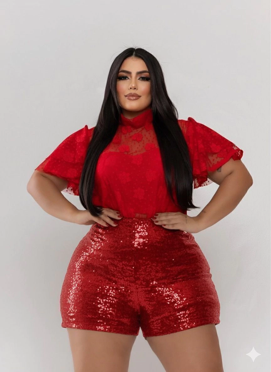 | Tecido: | Tecido do Cropped: Renda Forrada Tecido do Short: Paetê forrado em helanca |